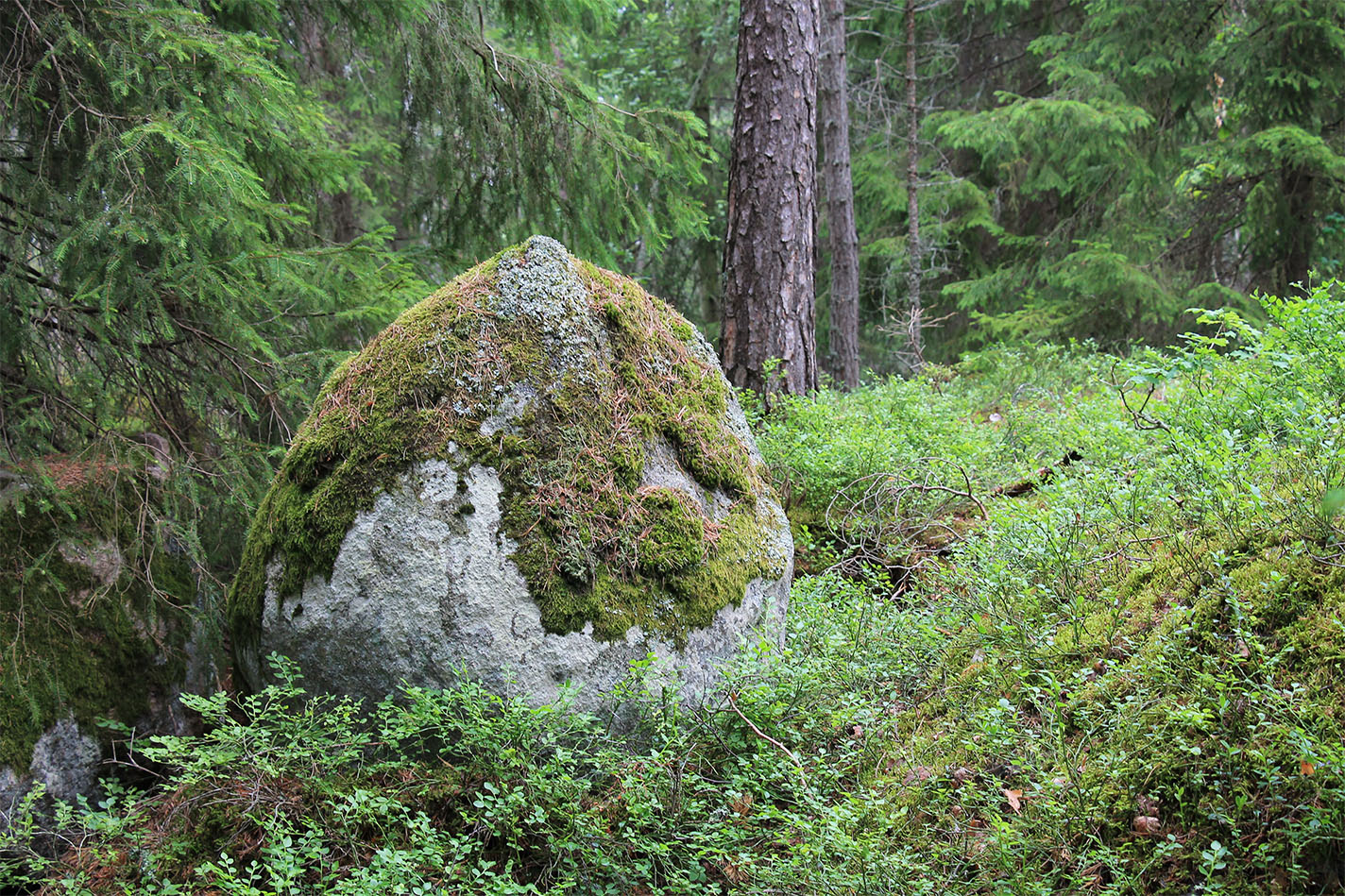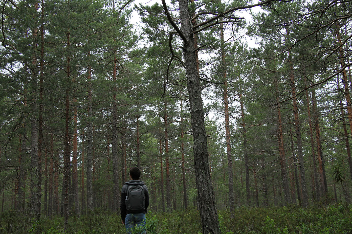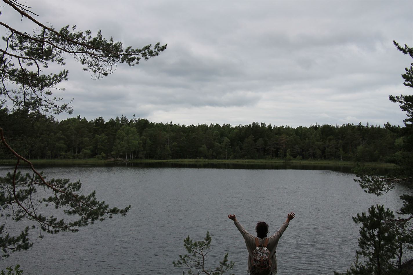 Nous sommes finalement rentrés dans la forêt par la partie Sud-Est. Nous avons marché jusqu’au lac Snuggan. Il faisait gris et les nuages étaient bas mais nous n’avions pas froid. Nous étions totalement seuls dans cette immense forêt. D’ailleurs, nous aurons croisé personne tout au long de cette journée. Mais comme beaucoup de nos journées en Suède, nous avons à nouveau décidé de nous frayer nos propres chemins, jusqu’alors, inexistants sur la carte. C’est donc face à ce lac et assis sur un rocher, que nous avons mangé notre pique-nique.